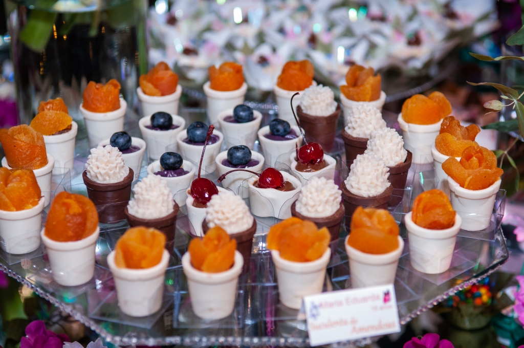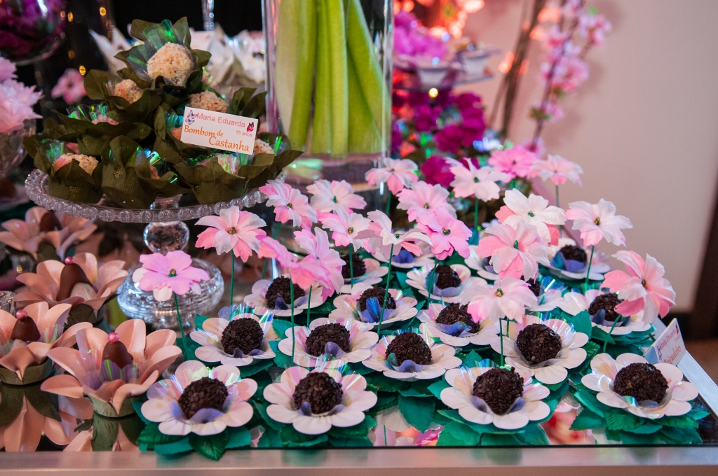 Em todas as cores de forminhas, todas as cores de doces, e cores de flores para compor uma mesa alegre e delicada como a debutante sonhava que fosse o destaque da mesa de doces do evento. Algumas forminhas foram feitas pela própria vó da debutante que fez questão de levar esse detalhe para a debutante que aprendeu artesanato desde os sete anos.