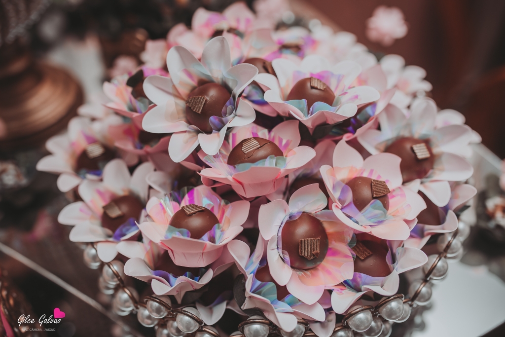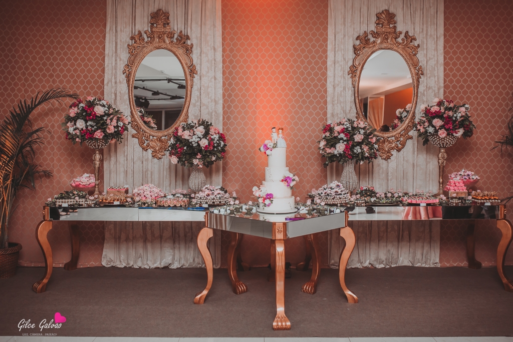 Rosa eram as cores principais da mesa de doces, onde o dourado iria trazer a sofisticação da mesa de doces, tanto nas decorações de doces como na decoração do bolo real, exposto na mesa feito pela confeiteira Mari: Flor de Açúcar, e a decoração ficou pelas mãos da Alessandra Lourini.